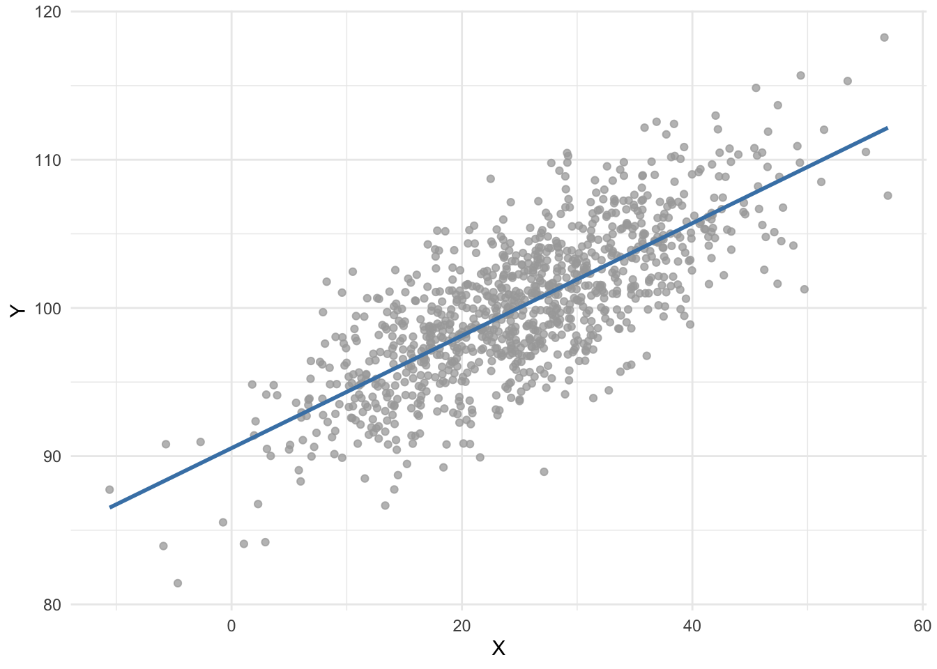 Sabemos que una regresión lineal es una forma conveniente de estimar la relación entre una variable dependiente cuantitativa continua y una o más variables independientes (de cualquier tipo). Por ejemplo, supongamos que nos gustaría estimar la relación entre dos variables cuantitativas, \(X\) e \(Y\). Usando el método de mínimos cuadrados ordinarios (el estimador más común utilizado en la regresión lineal), obtenemos la siguiente línea de regresión: