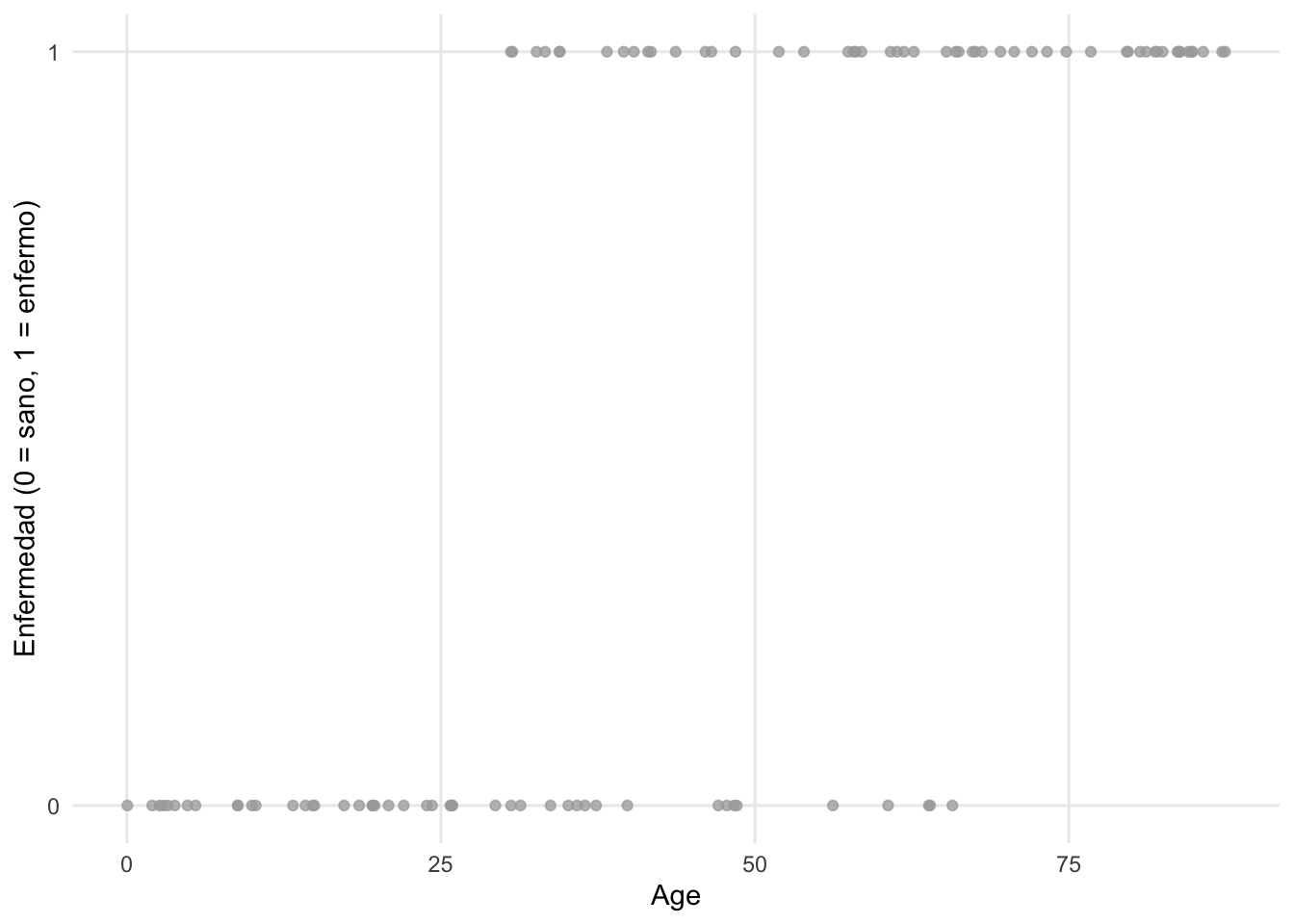 Ahora supongamos que estamos interesados en estimar el impacto de la edad en si un paciente tiene o no una determinada enfermedad. La edad se considera una variable cuantitativa continua, mientras que tener la enfermedad es binario (un paciente está enfermo o sano). Visualmente, podríamos tener algo como esto: