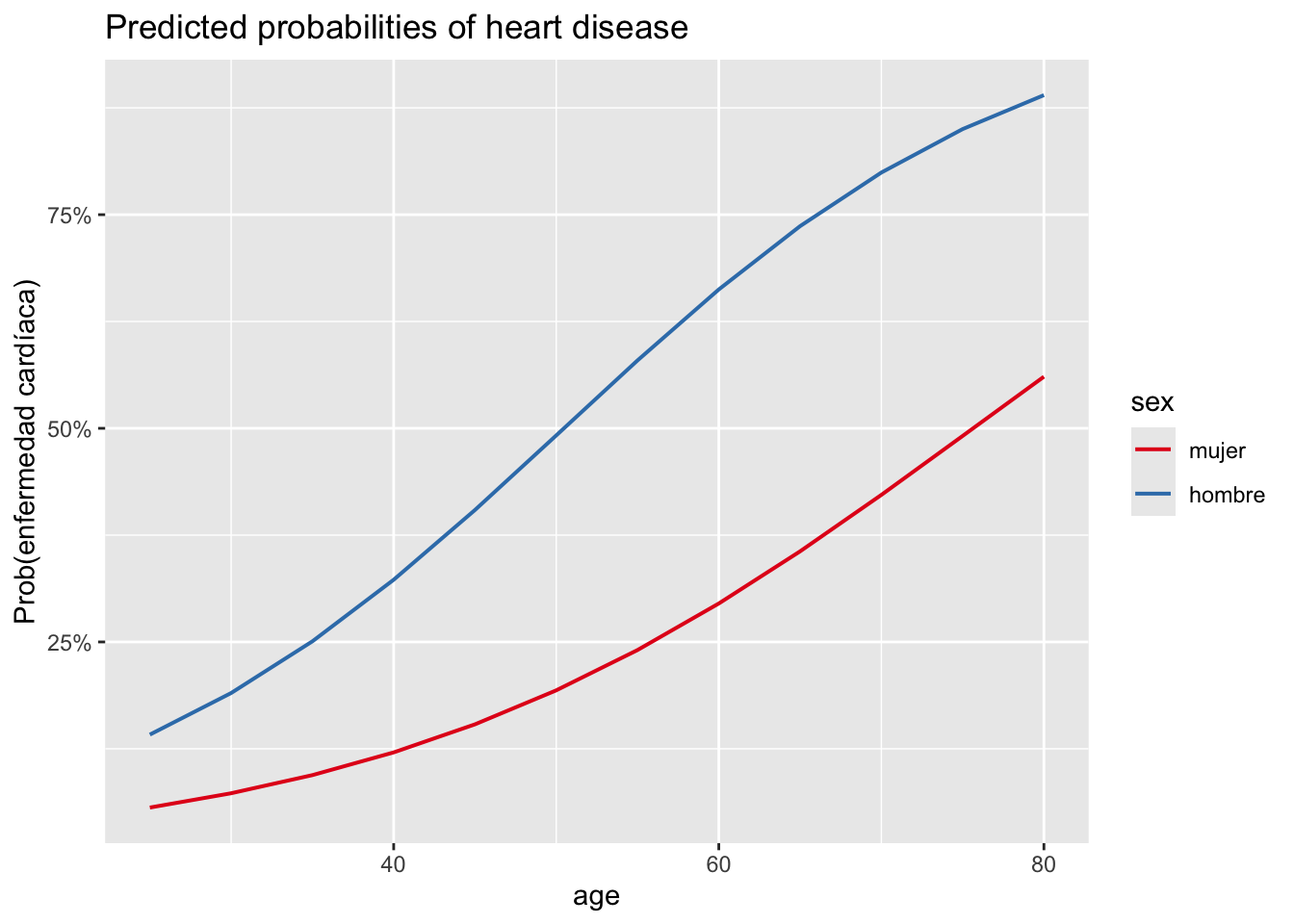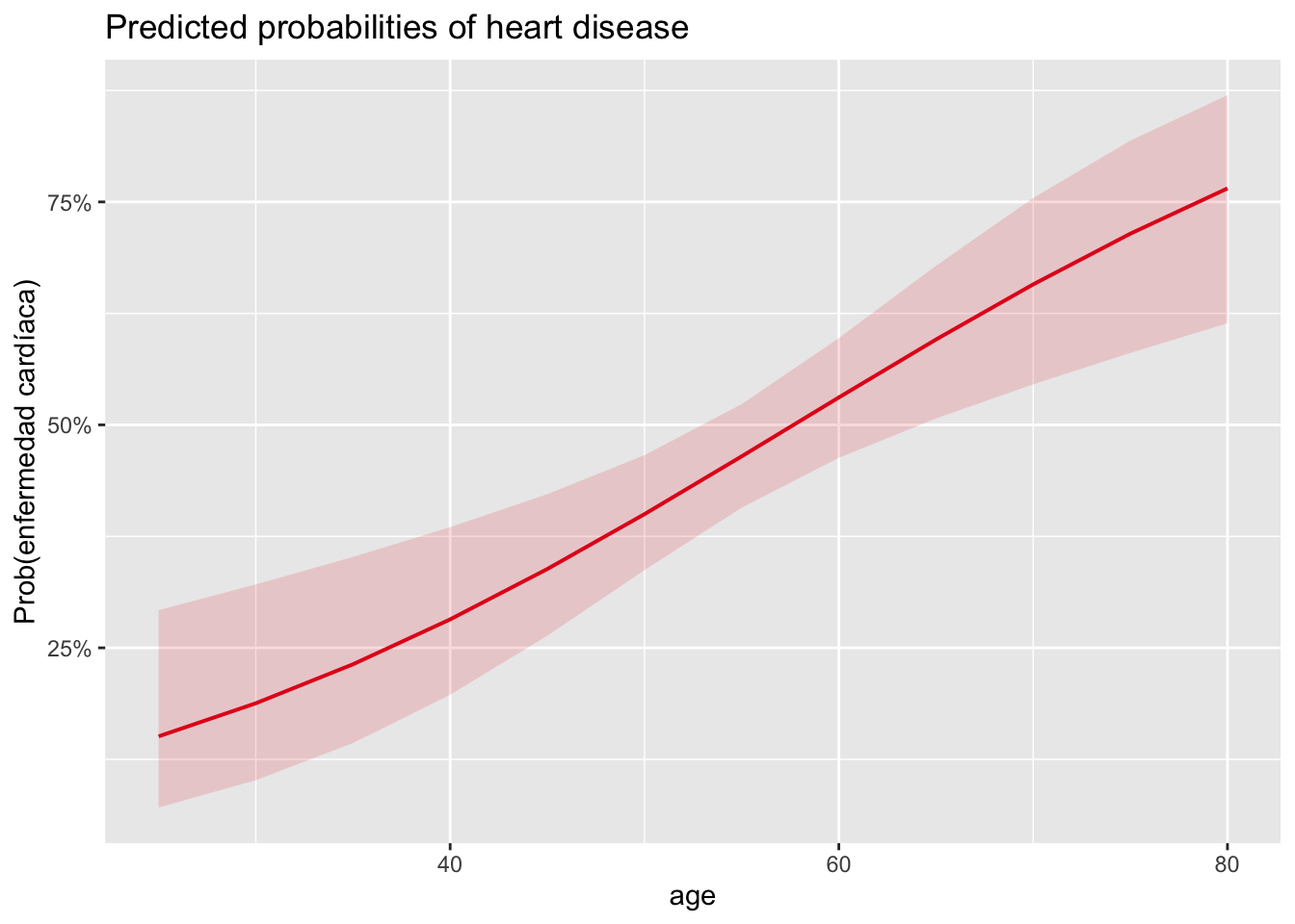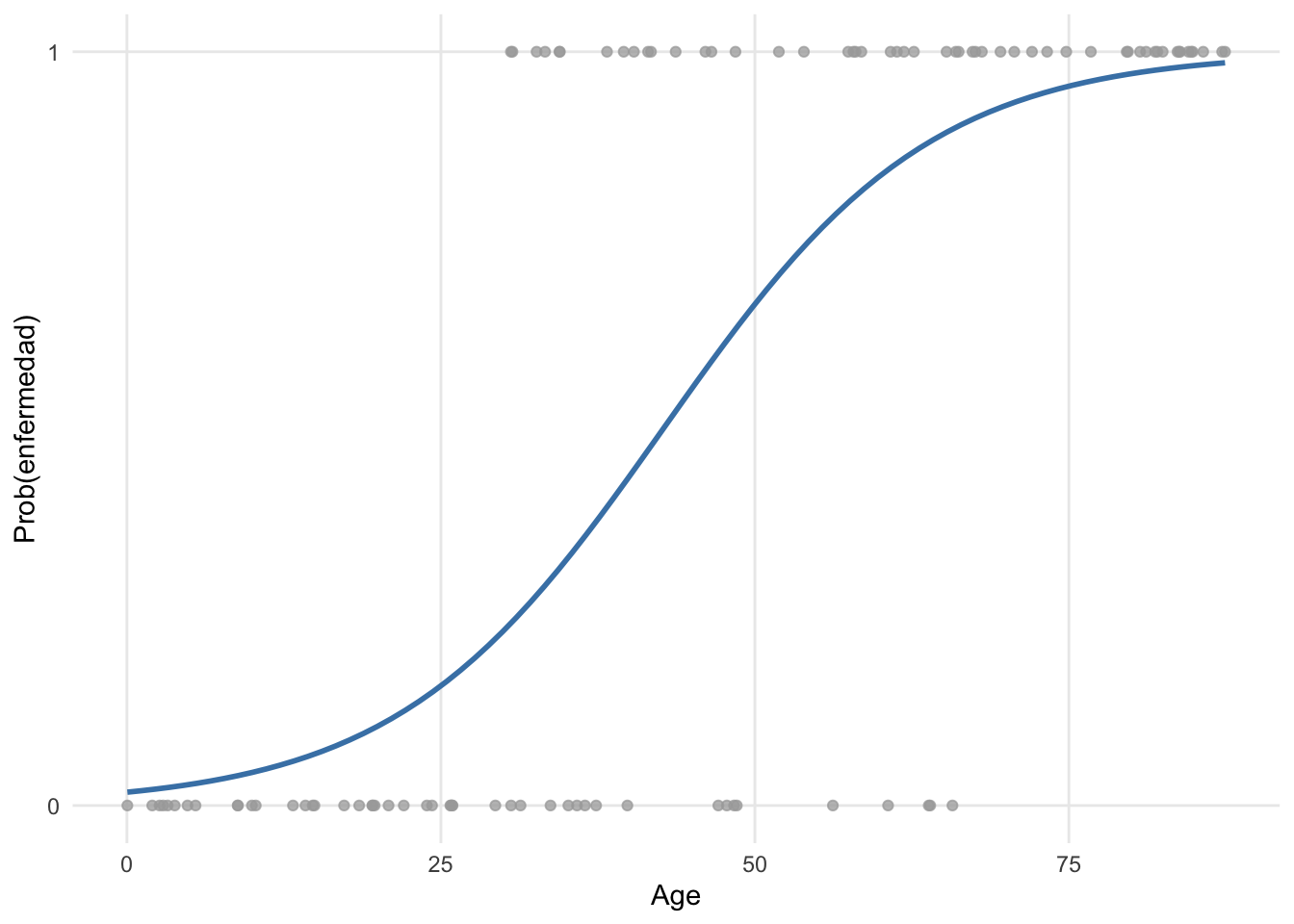 Se podría decir que los valores ajustados (= representados por la curva azul) que toman valores entre 0 y 1 tampoco parecen tener sentido, ya que un paciente solo puede estar sano o enfermo (y, por lo tanto, la variable dependiente solo puede tomar el valor 0 o 1, respectivamente). Sin embargo, en una regresión logística binaria no se modela directamente el resultado de no enfermedad/enfermedad, sino la probabilidad de que un paciente tenga la enfermedad o no, dadas sus características. Esta probabilidad se enmarcará en términos de una probabilidad de observar o no la enfermedad en un paciente, que de hecho está incluida entre 0 y 1, o 0% y 100%.
