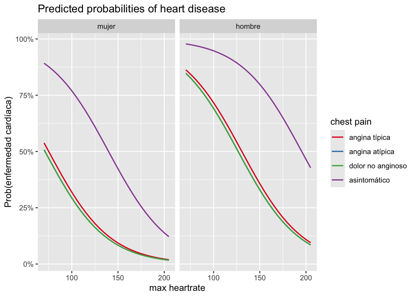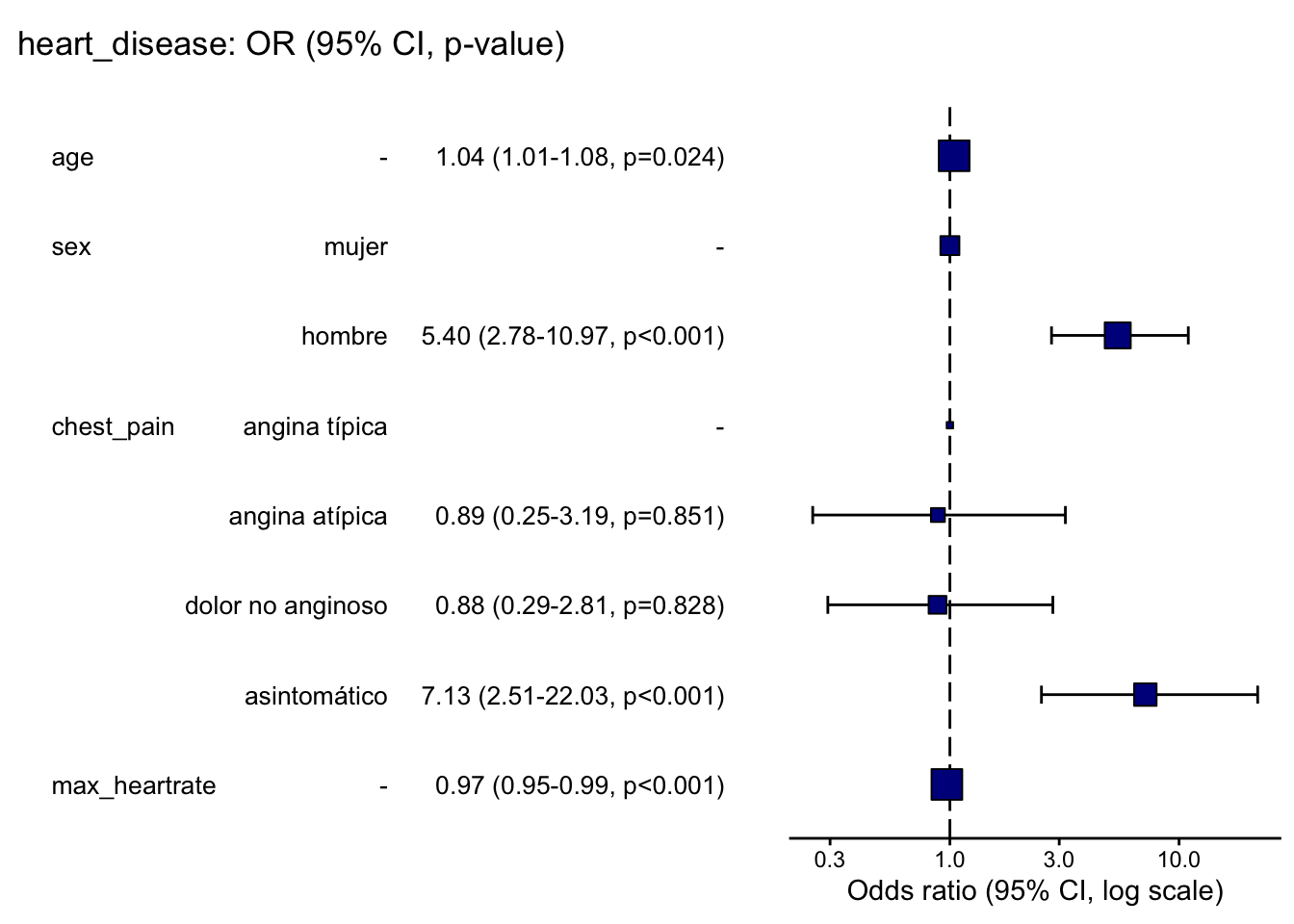 Ten cuidado de que a veces el cuadrado es demasiado grande para ver las líneas del IC del 95%. Este es el caso de las variables max_heartrate y age. En estos casos, es mejor verificar la significancia del OR gracias a sus IC del 95% o los valores \(p\) impresos entre paréntesis.