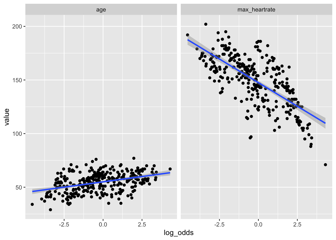 - Las variables independientes cuantitativas deben tener una relación lineal entre sus log-odds y sus valores observados. Una comprobación visual es suficiente, mira a continuación con la edad, la frecuencia cardíaca máxima alcanzada y el modelo